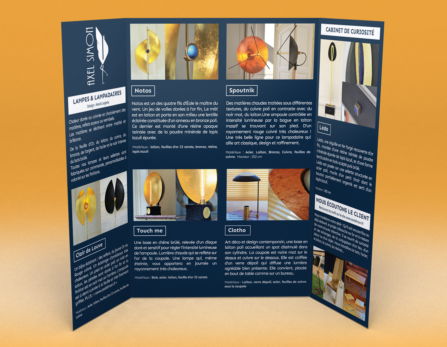 Le jeune créateur d'objets d'art Axel Simon a fait appel a moi afin de réaliser ce document à destination de galeries ou de collectionneurs. Il s'agit ici de présenter chaque réalisation avec son argumentation et ses caractéristiques techniques. La part belle est laissée aux oeuvres et la mise en page met en avant le travail de l'artiste sur la lumière et la texture des matériaux.