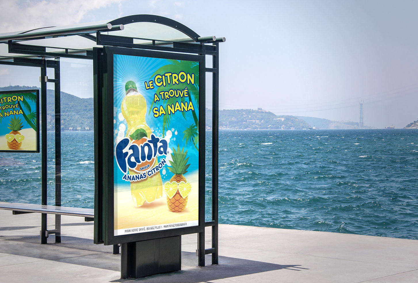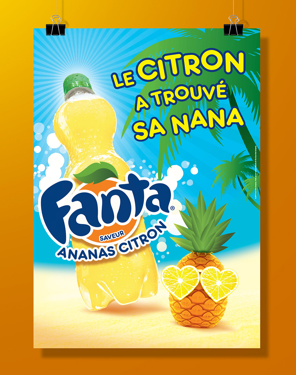 Création d'un visuel pour le lancement de l'édition limitée Fanta ananas citron, déclinable sur un multitude de supports publicitaires..