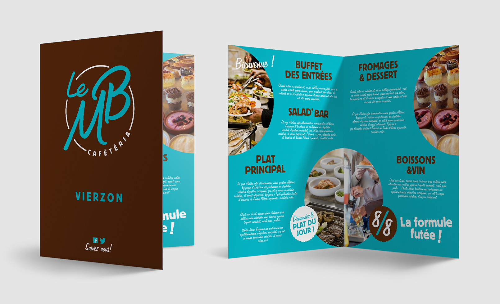 Désireuse de moderniser son image, la cafétéria autrefois connue sous le nom "Le Mouton Bleu" a fait appel a moi pour la création de sa nouvelle identité "Le MB". Le logo s'accompagne d'une petite charte graphique, permettant de développer les supports de communication de manière cohérente.