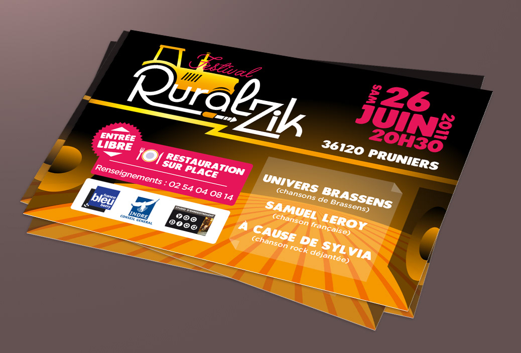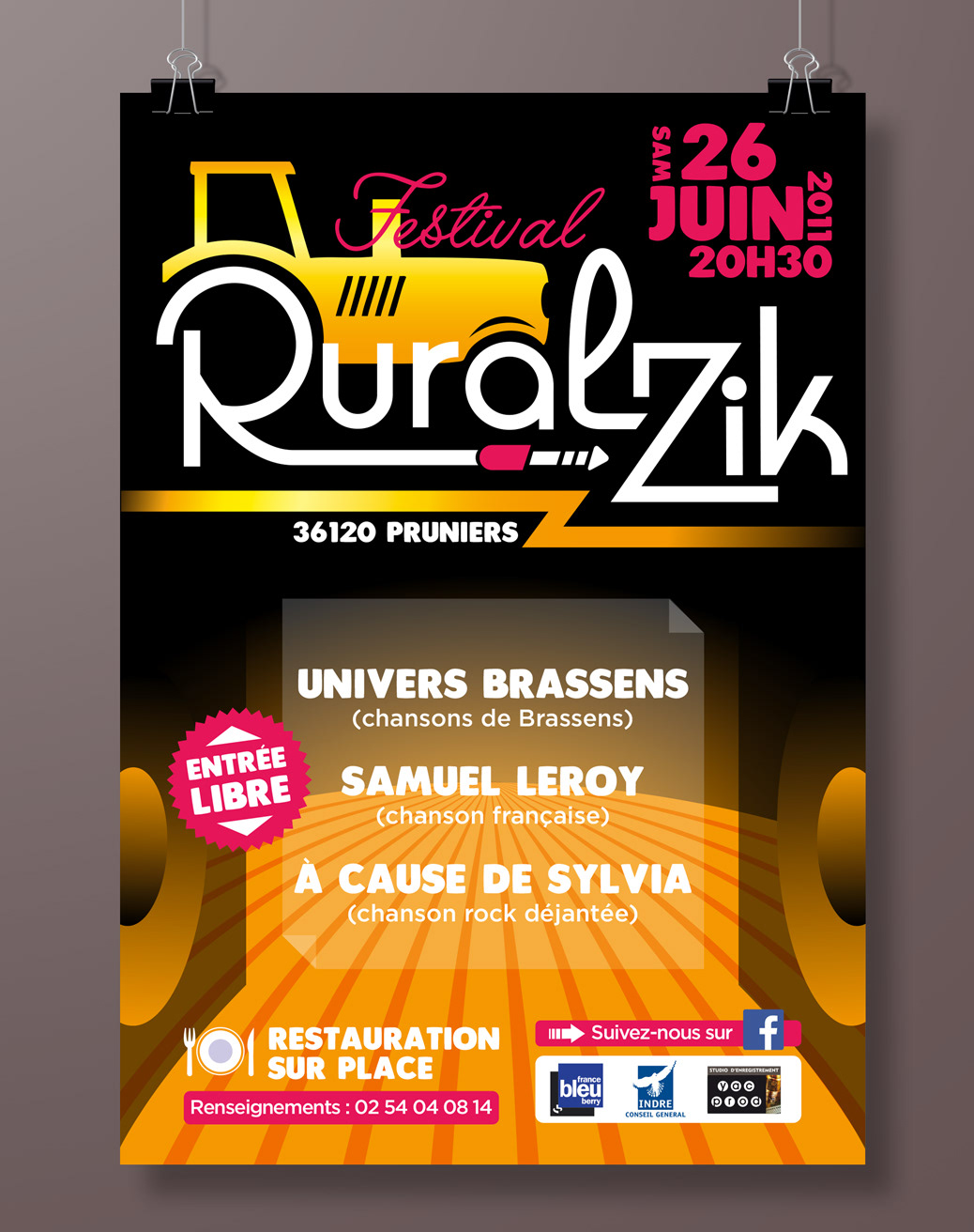 Visuel réalisé pour un petit festival de campagne gratuit. Le logo et le principe d'affiche crée en 2011 est decliné chaque année par l'équipe du festival.